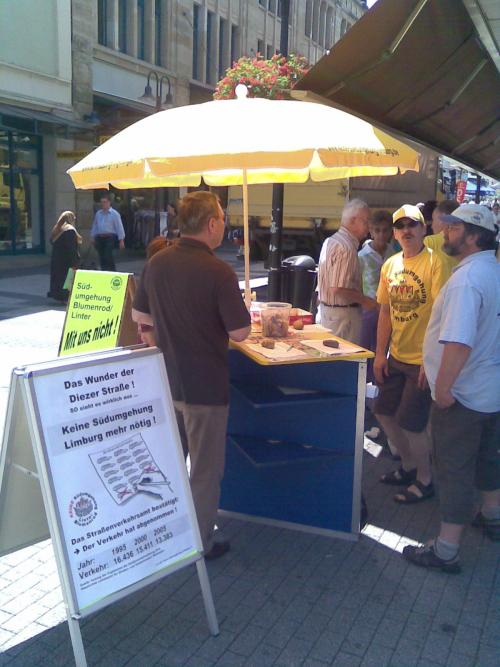 Mit unseren Informationsständen in der Fußgängerzone wollen wir fortlaufend die Einwohnerinnen und Einwohner von Limburg über die geplante Südumgehung aufklären.