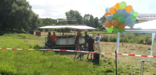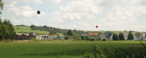 Mit Absperrband und Riesen-Ballons kennzeichnete die Initiative "Ja zur Aar" Verlauf und Dimension eines Brückenbauwerks am Sportplatz in Holzheim.